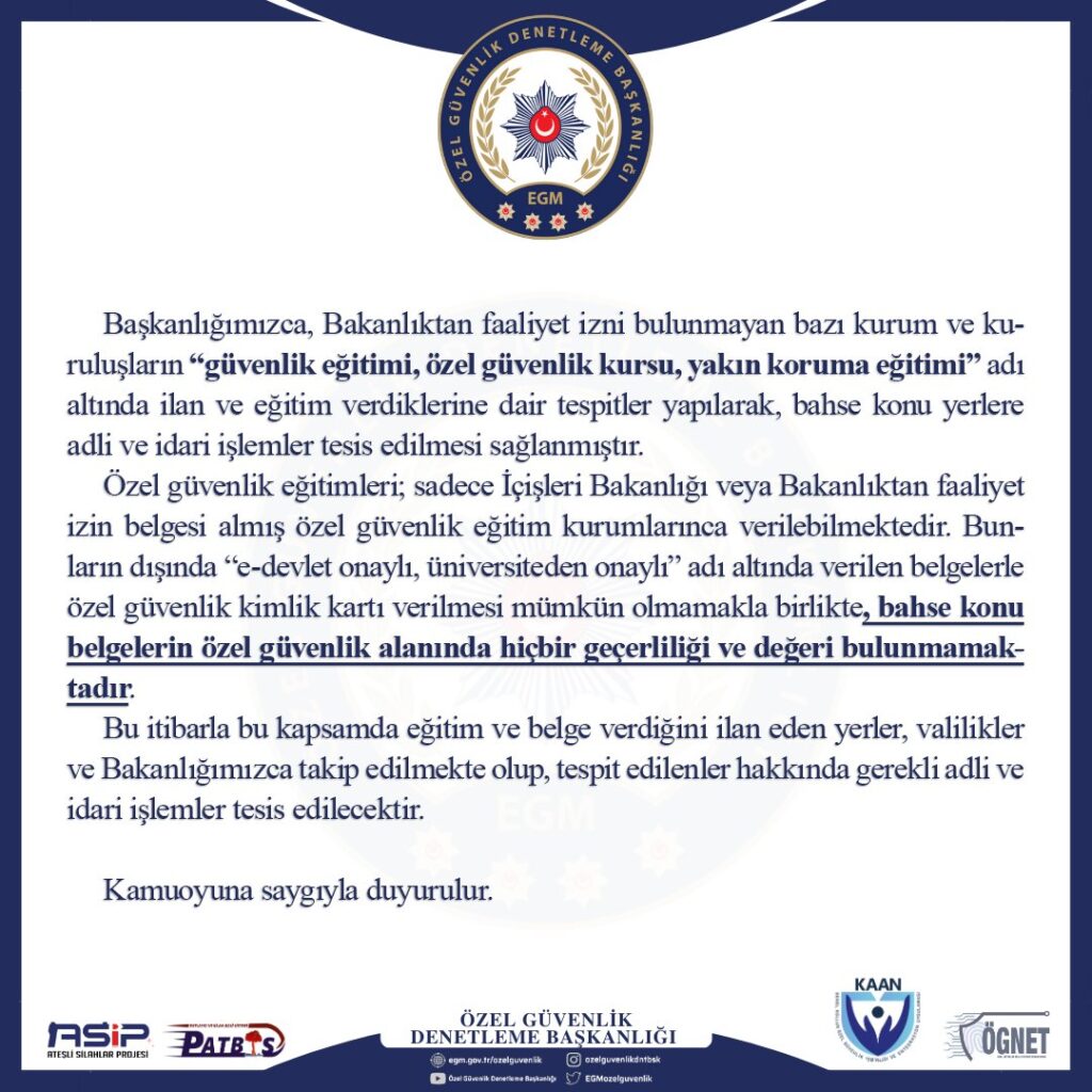 EGM Özel Güvenlik Denetleme Başkanlığının resmi web sitesinden de bu konuyla alakalı bir bilgilendirme yayınladı. Bilgilendirmede ”Bakanlıktan faaliyet izni bulunmayan bazı kurum ve kuruluşların verdikleri belgelerin özel güvenlik alanında hiçbir geçerliliği ve değeri bulunmamaktadır” denildi.