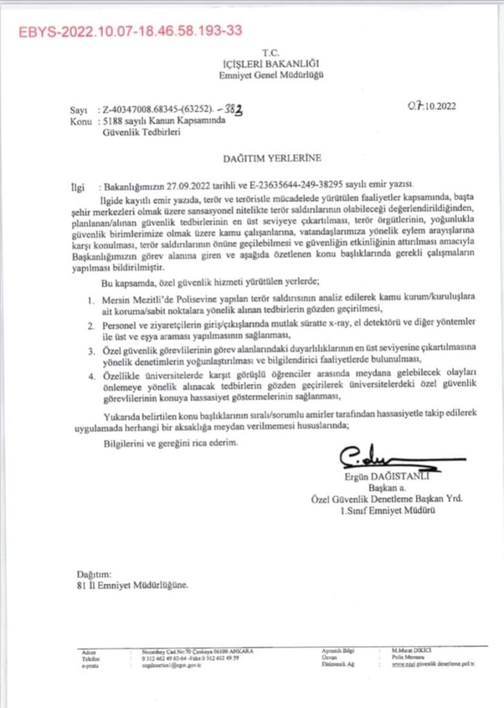 İçişleri Bakanlığı 81 İl Emniyet Müdürlüğüne Resmi Yazı Göndererek Özel Güvenlik Tedbirlerinin Attırılması Talebinde Bulundu.