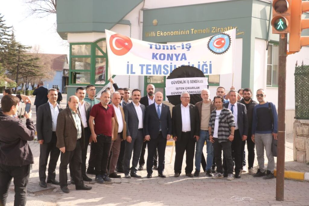 Anadolu Birlik Holding Simurg Güvenlik firmasında çalışan 10 özel güvenlik görevlisinin işten çıkarılmasının ardından, konuya dikkat çekmek amacıyla Güvenlik-İş Sendikası bir basın açıklaması gerçekleştirildi. Konya Şeker Fabrikası önünde düzenlenen etkinliğe, Güvenlik-İş Sendikası Genel Başkanı Ömer Çağırıcı, Genel Başkan Yardımcıları Ahmet Durcuk ve Fevzi Karataş, Konya Bölge Başkanı Oğuzhan Bostan, TÜRK-İŞ Konya İl Başkanı Abdulkadir Tamak, TÜRK-İŞ’e bağlı sendikaların şube başkanları ve işten çıkarılan özel güvenlik görevlileri katıldı.