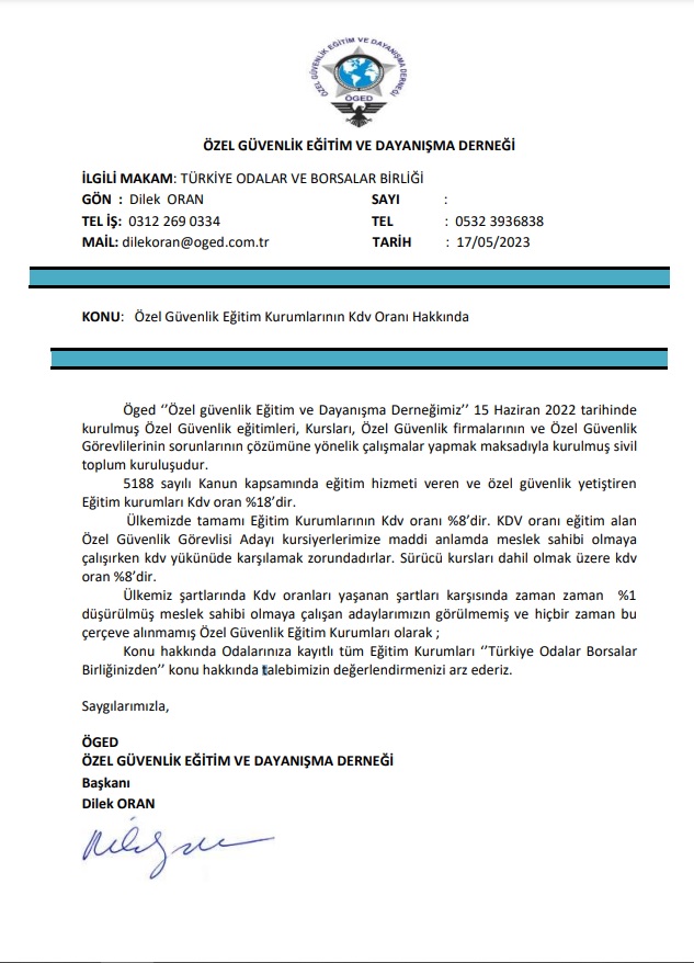 Özel Güvenlik Eğitim ve Dayanışma Derneği (ÖGED), Özel Güvenlik Eğitim Kurumlarının KDV oranın düşürülmesi konusunda Türkiye Odalar ve Borsalar Birliği’ne başvuruda bulunarak çözüm talep etti.