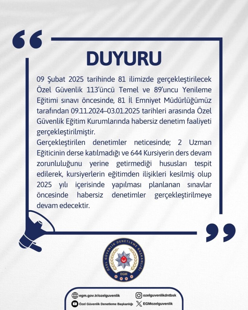 Emniyet Genel Müdürlüğü Özel Güvenlik Denetleme Başkanlığı tarafından, 9 Şubat 2025’te gerçekleştirilecek 113. Temel ve 89. Yenileme Eğitimi sınavı öncesinde 81 ilde özel güvenlik eğitim kurumlarına habersiz denetim yapıldı.