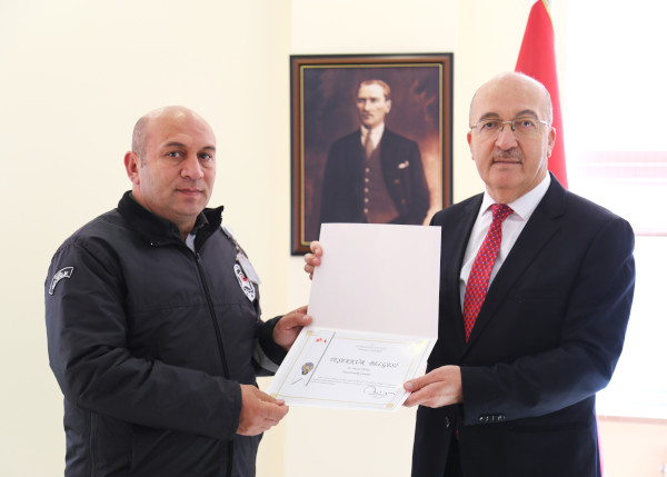 Üniversitemiz Özel Güvenlik personellerinden Vildan Aksu ve Necati Tanış’a hazırlanan teşekkür belgeleri Vali Aydın Baruş ve Rektörümüz Prof. Dr. Halil İbrahim Zeybek tarafından verildi.